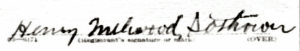Henry Melwood Sothoron registered as Serial No. 856, Order No. a2180. He was a 42 year old White, born Aug. 15, 1876 in USA, living at 1411 7th St. SE, Washington, DC. Occupation Foreman Shipping Dept, Wash. Steel & Ord. Co., Gresboro Point, Washington, DC. Nearest Relative was James Hoskins Sothoron, bor 154 D St. SE, Washington, DC. Physical description is tall, slender, blue eyes, L. brown hair, no impairments. (Draft Registration Card, World War I, Division 11, Washington, DC, 1918.09.12) Signature on card: