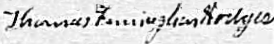Thomas Finninghen Hodges of Perryville, Cecil Co., MD registered for the draft at Elkton, Md. on 12 Sept 1918. He was 35 years old, born 6 June 1883, White, native born. Occupation Freight Engr. for P.R.R. at Perryville, Cecil Co., Md. Nearest relative was wife, Grace V. Hodges, same address. Described as medium height, stout, blue eyes, bald, no impairments. Serial No. 1155, Order No. A-2026. (Ancestry.com* - image of World War I Draft Registration Card) Signature on card: