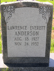 Sothoron & Related Families - 232 (Notes Pages)For privacy reasons, Date of Birth and Date of Marriage for persons believed to still be living are not shown. Anderson Lawrence Everett [Male] b. 18 AUG 1927 Maryland - d. 24 NOV 1932 St. Joseph's Catholic (New), Morganza, St. Mary's Co., MD