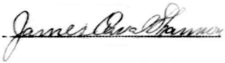 James Orville Shannon of 310 S. 7th, Hiawatha, Kas. registered for the draft at Hiawatha, Kansas on 5 June 1917. He was 30 years old, Caucasian, married with 3 children, born 21 July 1887 in Brown Co., Kansas. Occupation self-employed Veterinarian at Hiawatha, KS. Described as tall, stout, blue eyes, dark brown hair,not bald, no impairments. Form #150, Card #13. (World War Draft Registration Card) Signature on card: