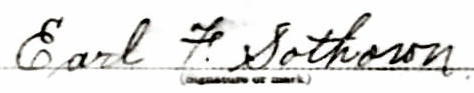 Earl Francis Sothoron registered as No. 1506 (2055). He lived at 530 10 NE. He was born in Washington, DC on October 11, 1890. He was 26 years of age, Caucasian & single. Occupation Machinist at U. S. Navy Yard, Washington, DC. Dependents were Mother (widow), sister & brother under 12. He had served as a Private in DC Militia, DC National Guard for 6 years. Physical description was medium height & build, blue eyes, brown hair. Examiner noted, "I am not sure about his mother sister and brother being dependent.” (Draft Registration Card, World War I, Precinct 9, Washington, DC, 1917.06.05) Signature on card:
