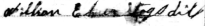 William Elmer Stogsdill of Bent, Pulaski Co., KY registered for the draft at Somerset, KY on 12 Sept 1918. He was 18 years old, White, born 20 June 1900 in USA. Occupation Farming, employed by W.L. Stogsdill of same address. Nearest relative was Lucy J. Stogsdill of same address. Described as of medium height & build, blue eyes, brown hair, no impairments. Serial No. illegible, Order No A-227. (Ancestry.com* - image of World War I Draft Registration Card) Signature on card: