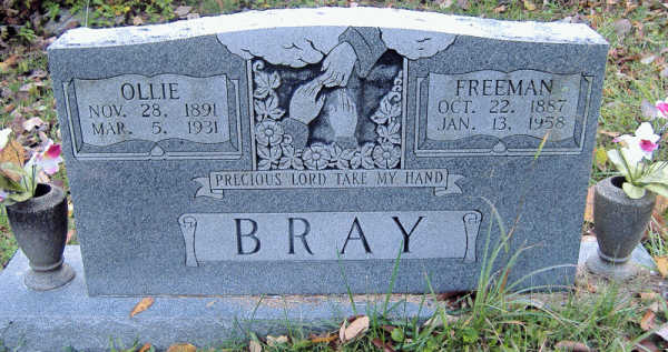 1930 Federal Census (1930.04.01, Recorded 1930.04.14) Dist. 8, Pulaski Co., KY - ED 32, Sh 6B, Ln 95, 116/116 (follows Freeman's parents' entry) - Bray, Freeman. Head, 40 year old married white male, first married at 20. Renting his non-farm home for $2 (sic) per month. Speaks English, cannot read nor write. He & parents born in Kentucky. Occupation Laborer at Rock Crusher, drawing wages. Not a war veteran. -----, Ollie. Wife, 39 year old married white female, first married at 19. Speaks English, cannot read nor write. She & parents born in Tennessee. Occupation None. -----, Dimple. Daughter, 15 year old single white female. Can read & write, speaks English. She & father born in Kentucky, mother in Tennessee. Occupation None. -----, Raymon. Son, 12 year old white male. Can read & write, speaks English, attended school since Sept. He & father born in Kentucky, mother in Tennessee. Occupation None. -----, Dorothy. Daughter, 10 year old white female. Can read & write, speaks English, attended school since Sept. She & father born in Kentucky, mother in Tennessee. Occupation None. -----, Stella. Daughter, 8 year old white female, attended school since Sept. She & father born in Kentucky, mother in Tennessee. Occupation None. -----, Edgar. Son, 5 year old white male, attended school since Sept. He & mother born in Tennessee, father in Kentucky. Occupation None. -----, Robert. Son, 4 year old white male. He & mother born in Tennessee, father in Kentucky. Occupation None. -----, Sherman. Son, 2 year old white male. He & father born in Kentucky, mother in Tennessee. Occupation None.