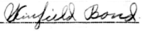 Winfield Bond of F.D.#3, Franklin, KY registered for the draft on 5 June 1917 at Pct.#11, Simpson Co., KY. He was 25 years old, Caucasian, married, born 16 April 1892 in Simpson Co., KY. Occupation self-employed Farmer at same address. No military experience. Described as tall, medium build, blue eyes, brown hair, not bald, no impairments. Card #75. (Ancestry.com* - image of World War I Draft Registration Card) Signature on card: