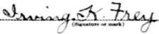 Irving K. Frey of 3010 P St. N.W., Washington, DC registered for the draft by mail to Baltimore, MD (undated). He was single, White, 25 years old, born 15 June 1888 at Washington, DC. Occupation Salesman with Fountain Chemical Co., 118 W. Lexington St., Balto., MD. Previous military experience was for 6 months as a Seaman Apprentice in the State Naval Reserve. Described as of medium height & build, gray eyes, brown hair, not bald, no impairments. Form #419, Card # 1250. (Ancestry.com* - image of World War I Draft Registration Card) Signature on card: