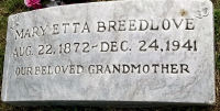 MARY ETTA BREEDLOVE AUG. 22, 1872 - DEC. 24, 1941 OUR BELOVED GRANDMOTHER