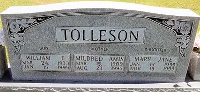 T O L L E S O N SON . . . . . . . . . . . MOTHER . . . . . . . . DAUGHTER WILLIAM E. . . . . .MILDRED AMIS . . . MARY JANE MAR. 24, 1933 . . MAR. 15, 1909 . . . . . JAN. 13, 1935 JAN. 15, 1995 . . . AUG. 23, 1995 . . . . . NOV. 13, 1999