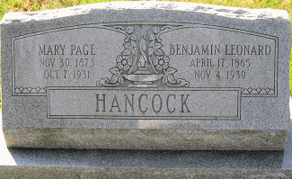 BENJAMIN LEE HANCOCK was born April 17, 1865 in MD to Mary Marcellina Sothoron & Josiah Hancock; and died November 04, 1939 in St. Mary's Co., MD. He married MARY PAGE ALVEY September 03, 1901 in St. Mary's Co., MD, daughter of JAMES ALVEY and ANN GRAVES. She was born November 30, 1873 in St. Mary's Co., MD, and died October 07, 1931 in St. Mary's Co., MD. (Reno*)