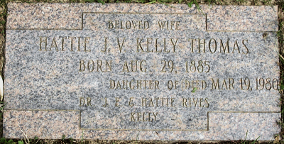 Hattie J. V. Kelly Thomas, 29 Aug 1885 - 19 Mar 1980, Beloved Wife; Daughter of Dr. J.E. & Hattie Rives Kelly. Buried at All Faith Episcopal, St. Mary's Co., MD. (Tice* :540)