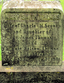 MARY SMITH THOMAS Wife of Charles M. Segars and Daughter of Dr. James Thomas and Nannie Nelson Thomas of De La Brooke Sept 19, 1872 - Dec 27, 1931 (Grave Marker*, All Faith Episcopal Church, Huntersville, St. Mary's Co., MD - between Grave Markers of mother & of sister Anita.)