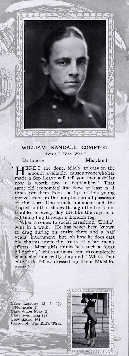 Name: William Randall Compton Race: white Address: 219 Woodlawn Road, Roland Park, Baltimore Co. Birth Place: Norfolk Va. Birth Date: 29 Oct 1899 Comment: USN 6/25/18 midshipman, Naval Academy Annapolis Md., Still in service 1/1/20 (Ancestry.com* - Maryland Military Men, 1917-1918)